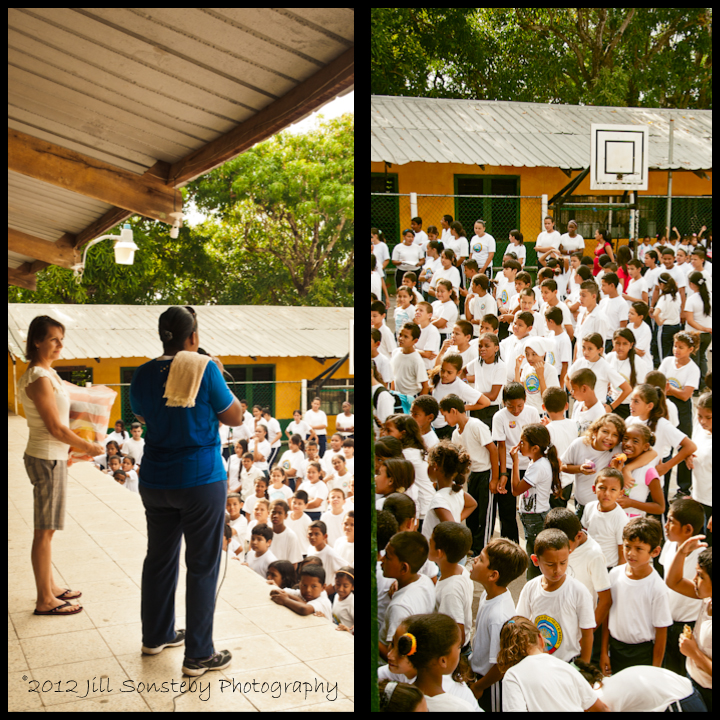 We never know what is going to happen when we arrive at the school. On Friday the entire school was gathered on the playground and hearing the necessary instructions of field day before heading out to the field. We had just enough time to put the boxes down in one of the classrooms and then we were asked to speak to the school and let them know who we are and why we are always there.  (There is a lot of spontaneity involved in this culture…and I love it!). I wanted to capture it all, so Jeanne did the honors and did it beautifully! We also presented a new volleyball and net to the gym teacher.