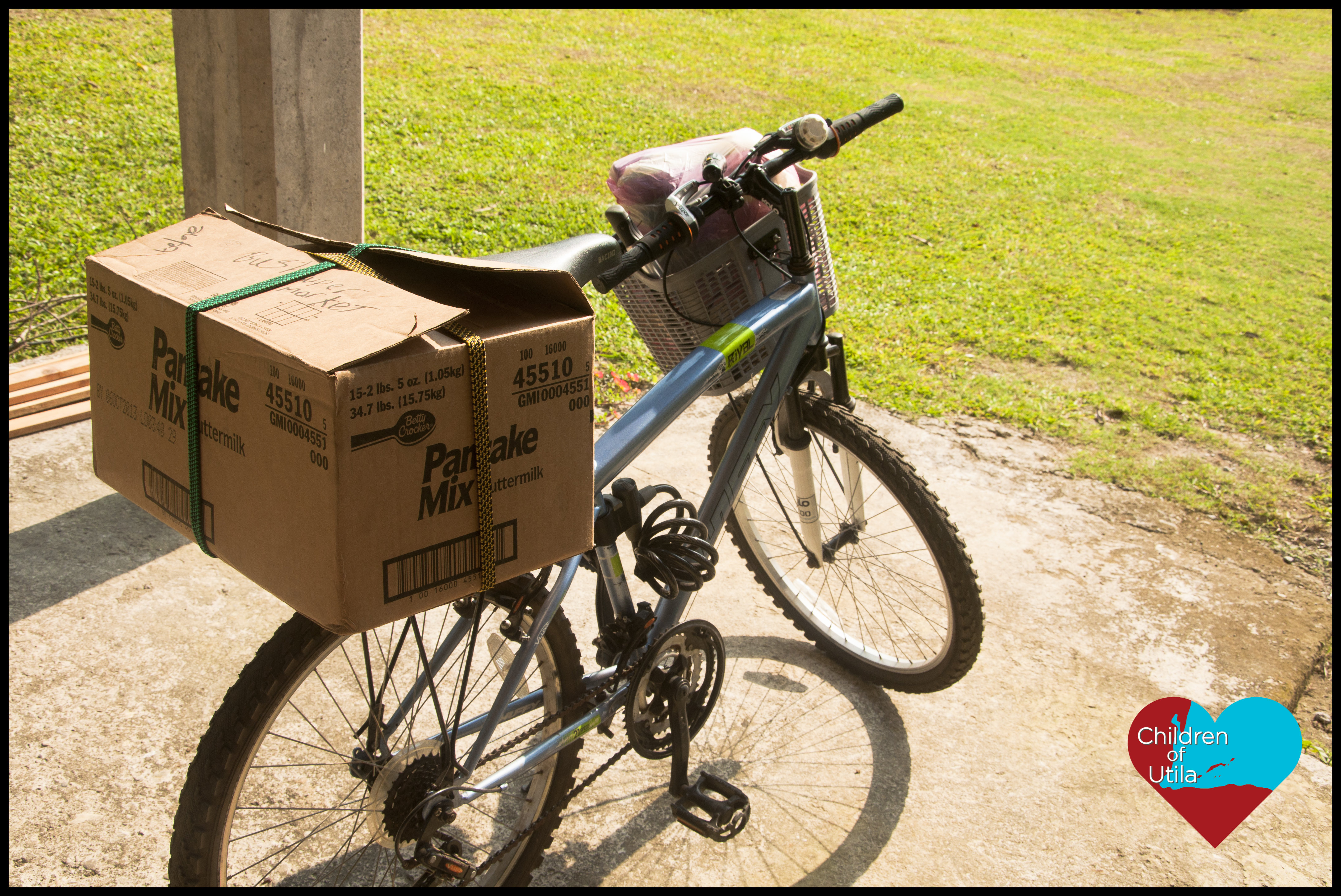 Donated school supplies assembled into packages and put in a box on my bike to deliver to each teacher at Utila's public school