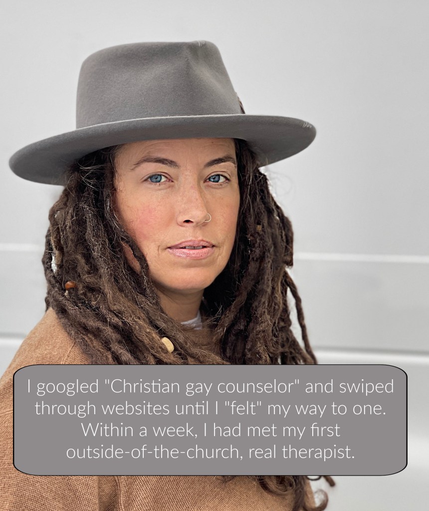 I googled “Christian gay counselor” and swiped through websites until I “felt” my way to one. Within a week, I had met my first outside-of-the-church, real therapist. I was nervous and yet, the stories I had to share were at a boiling point. I was not going to tip-toe into this relationship. I needed relief from all that I had been carrying. So, I committed to myself to not hold anything back.